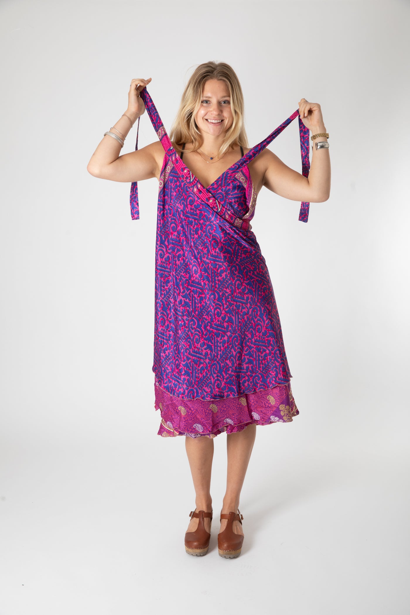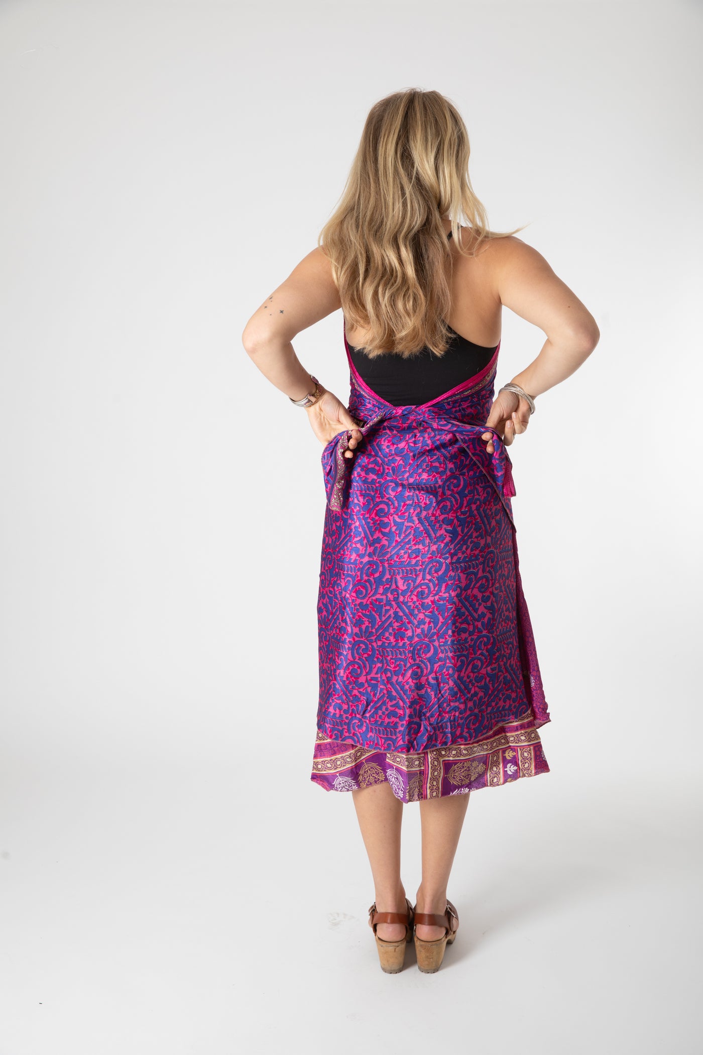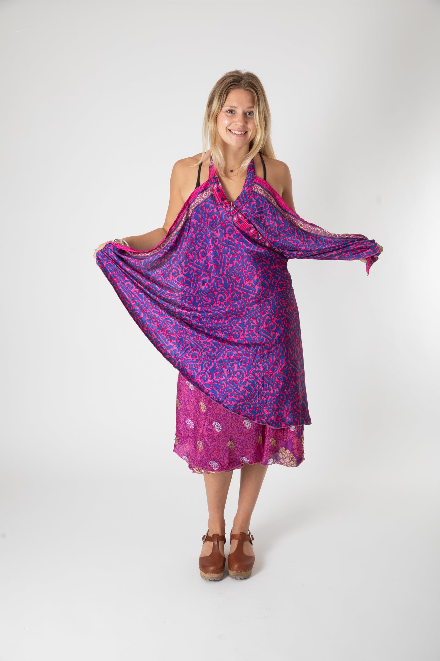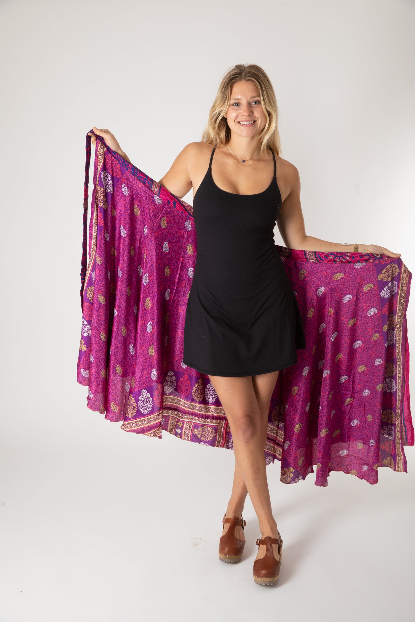 This flowy silk halter dress is made by following 6 easy steps and using one of our Long Sari Silk Wrap Skirts, a sprinkle of hippie style and dash of creativity!